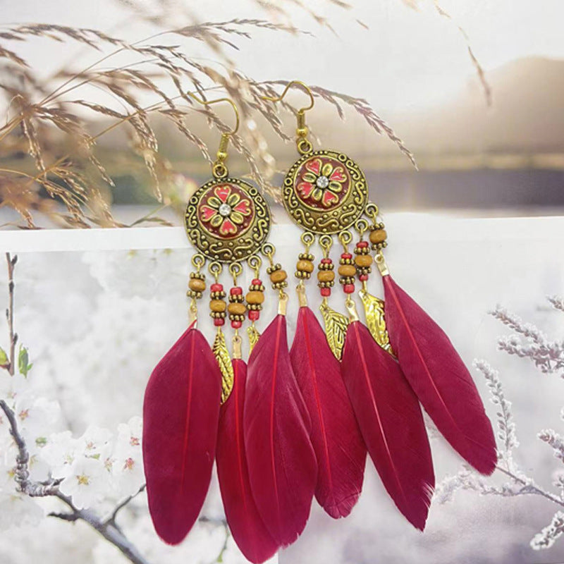 Pendientes de plumas con cuentas de flores bohemias para mujer