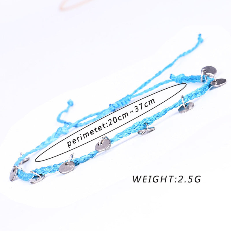 Esta impresionante tobillera bohemia es el accesorio perfecto para cualquier mujer que busque realzar su estilo. Hecha con hilo encerado resistente y con una técnica única de trenzado de obleas, esta tobillera encarna la esencia libre de la joyería bohemia. Disponible en varios colores, complementa a la perfección cualquier look.