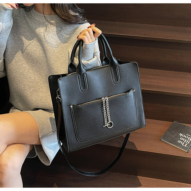 This spacious tote bag is designed for everyday commuting, crafted from soft PU material with a striking contrast color style. Its large capacity and horizontal square shape make it a practical choice for carrying daily essentials while maintaining a simple, fashionable look.
