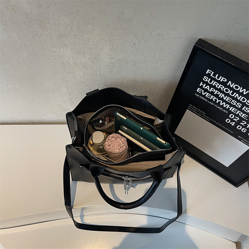 Made from durable and soft PU leather, this tote offers a comfortable grip and flexible use. The bag features a zipper closure to secure contents and a soft hardness that maintains its shape without being rigid. No additional interlayers are included.