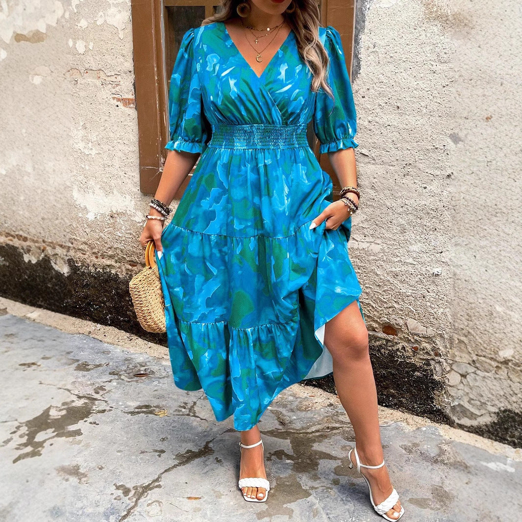 Este sofisticado vestido con estampado floral de talla grande combina elegancia y comodidad, lo que lo convierte en la opción perfecta para diversas ocasiones. El escote en V y las mangas abullonadas le dan un toque elegante y favorecen a las figuras con curvas.