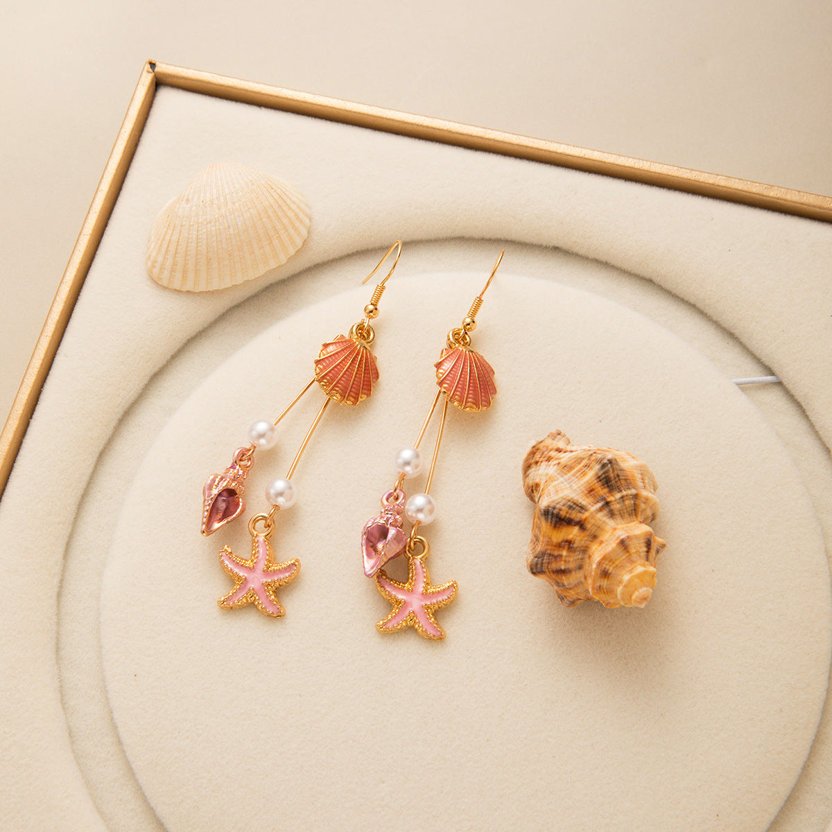 Enjoy a fresh and sweet vacation-inspired style with these sea-themed earrings crafted from zinc alloy. Designed with a charming starfish and shell motif, they bring a touch of oceanic elegance to your accessories collection.