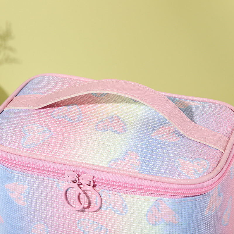 Este encantador neceser combina estilo y funcionalidad, perfecto para todos tus artículos de belleza esenciales. Su diseño de corazones brillantes con un vibrante degradado de arcoíris lo convierte en un accesorio imprescindible para las mujeres que aman viajar o mantener sus cosméticos organizados.