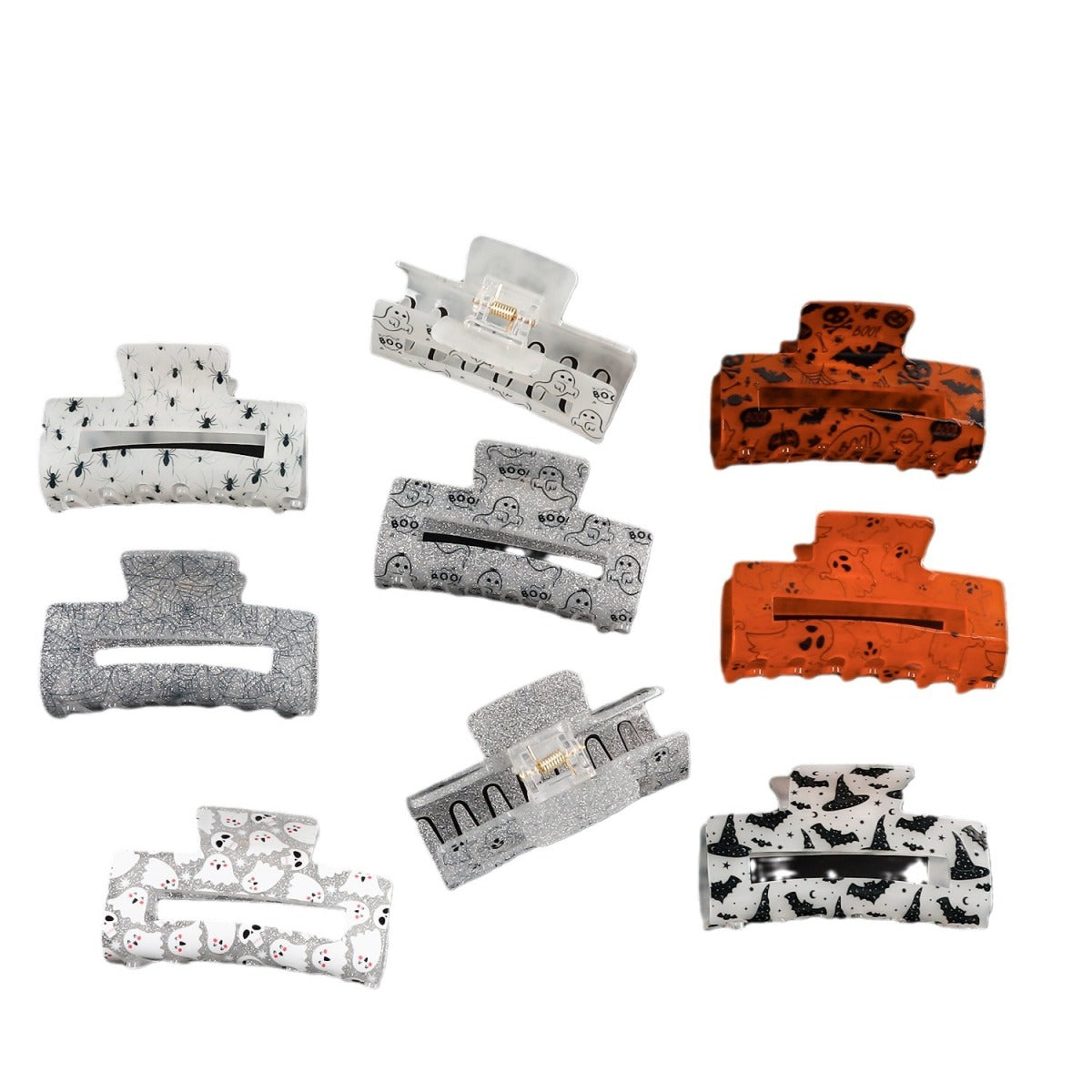 Este juego de pinzas para el pelo con temática de Halloween presenta divertidos diseños de fantasmas y calaveras, hechos de acrílico resistente. Diseñados para mujeres, estos accesorios para el cabello combinan diversión y estilo, perfectos para ocasiones festivas o para el día a día, y añaden encanto a cualquier peinado.