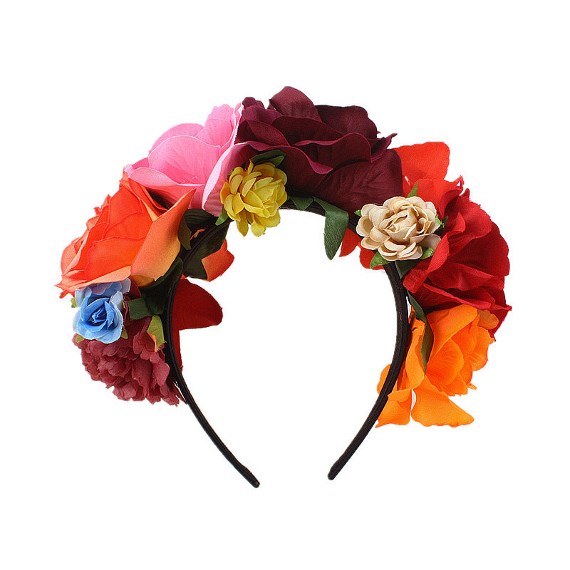 Diseño: Presenta rosas de tela surtidas en rojo burdeos, rosa, naranja y colores adicionales, dispuestas en una diadema flexible adecuada para varios tamaños de cabeza.