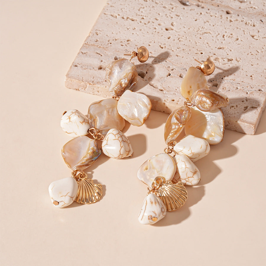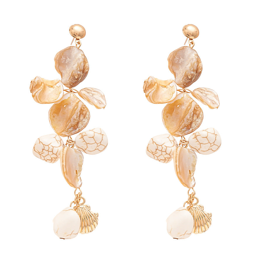 These shell starfish earrings crafted from natural shell materials feature a geometric design inspired by vacation wind styles. Available in silver needle-coffee color, they complement casual and beachwear outfits perfectly.
