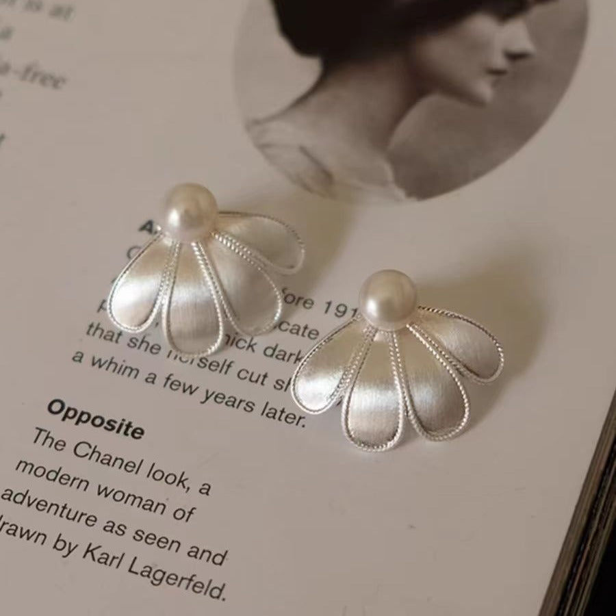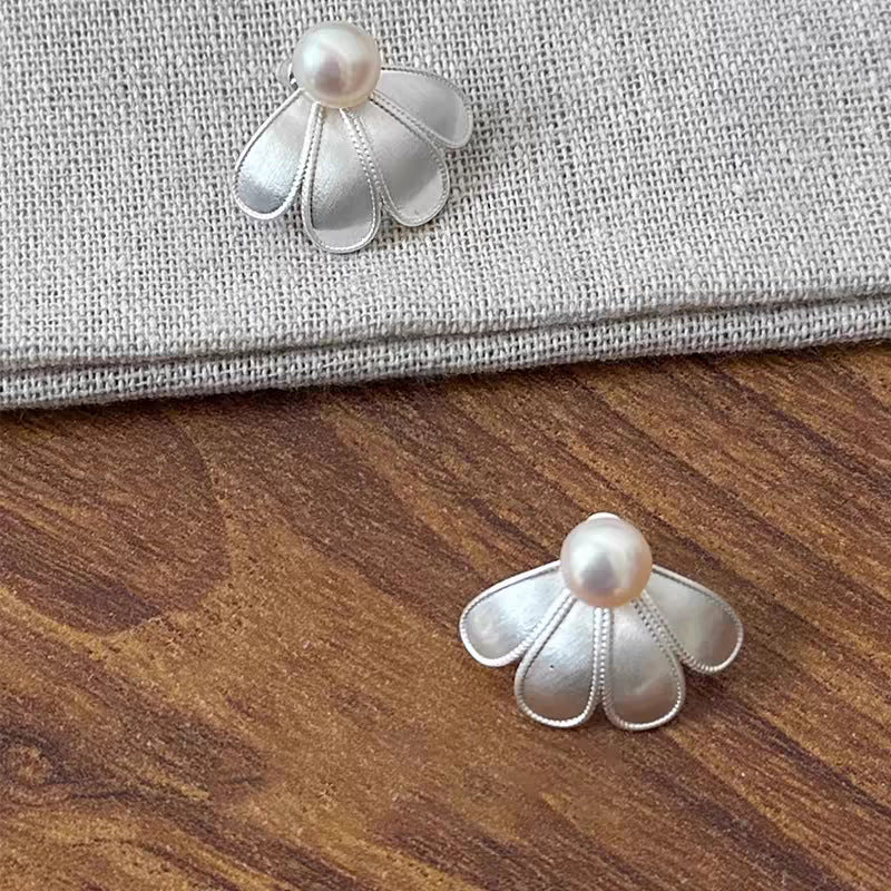 Pendientes de botón de plata de ley S925 con forma de pétalo de perla