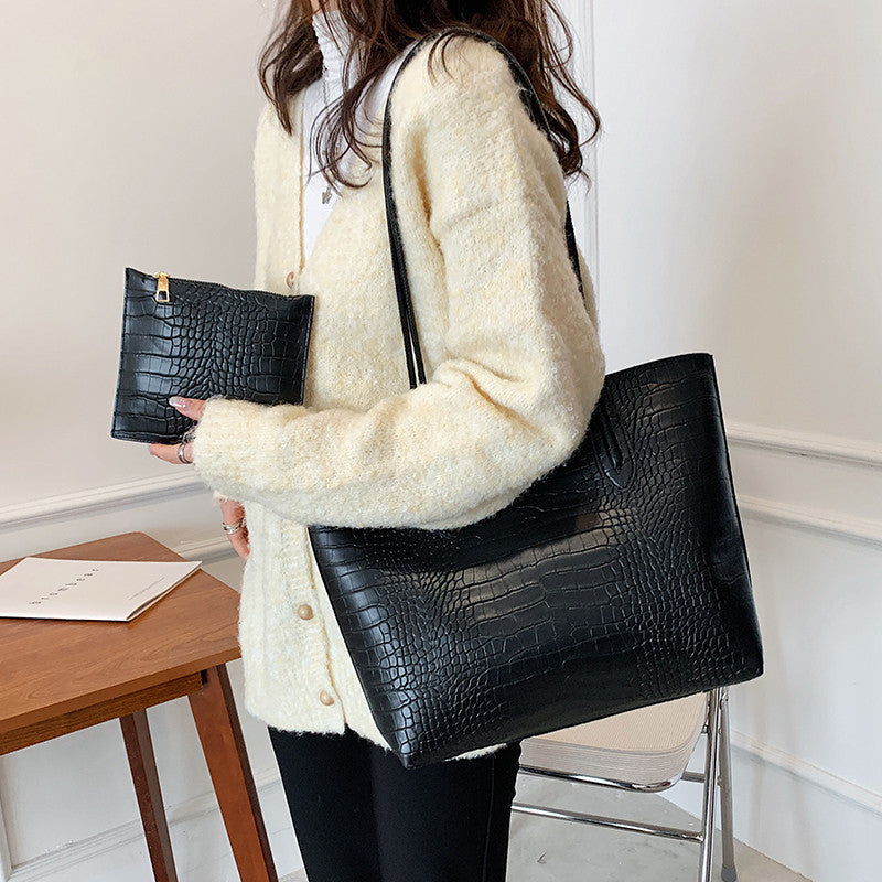 The Simple Solid Color Crocodile Print Tote Bag offers a stylish and spacious accessory made from durable PU material. Designed for urban use, its large capacity and sleek design make it practical for daily errands or shopping trips. Available in classic colors, it combines fashion with functionality.
