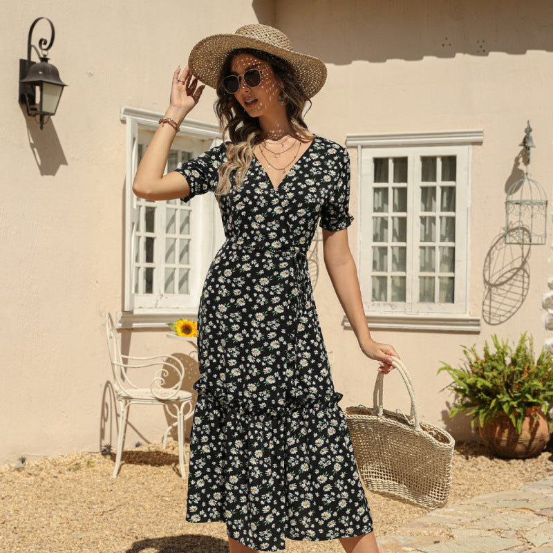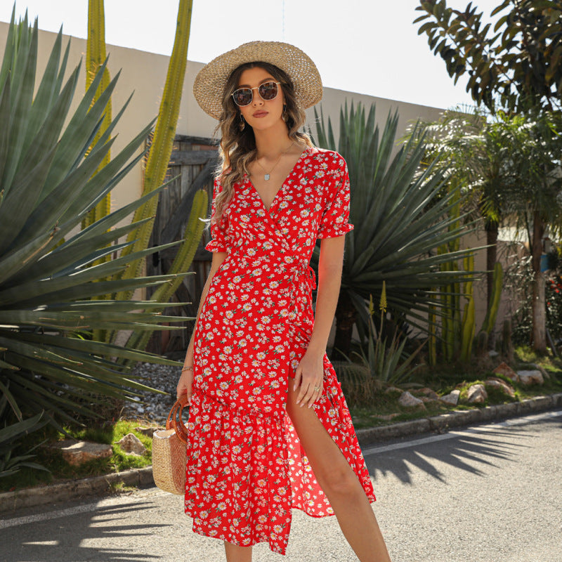 Vestido playero bohemio con estampado floral y cuello en V de gasa sexy de verano
