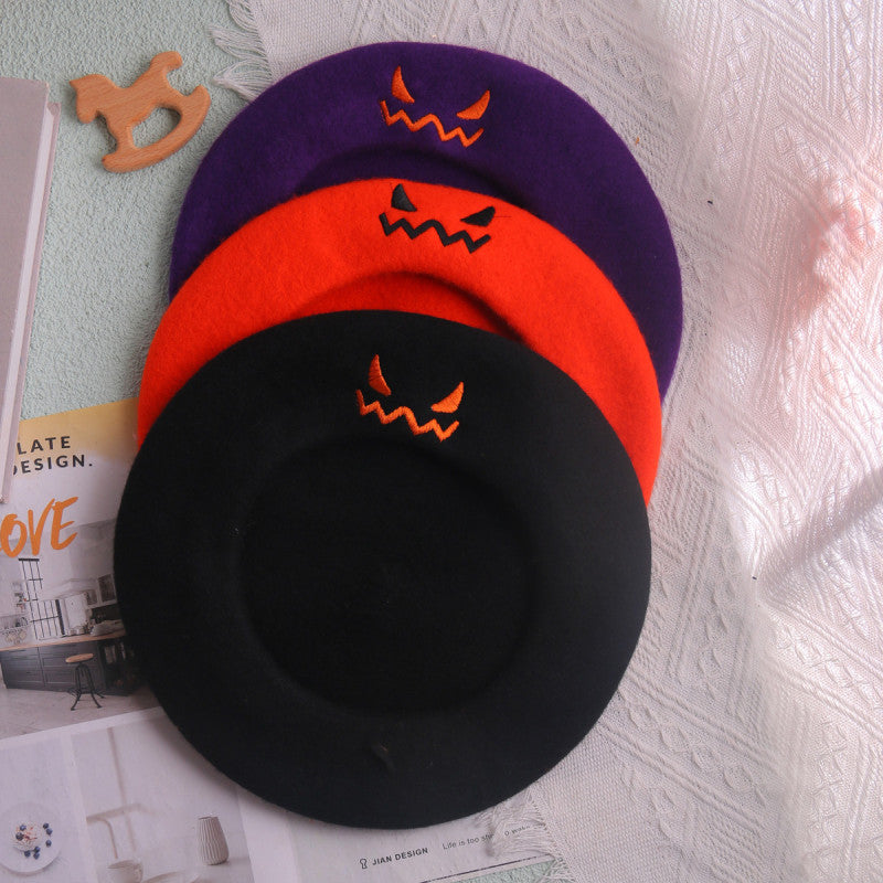 La boina está disponible en una variedad de colores, como beige, negro, marrón, naranja, morado, rojo intenso, blanco y amarillo. El detalle de calabaza bordada le da un toque único de temporada, ideal para las festividades de Halloween.