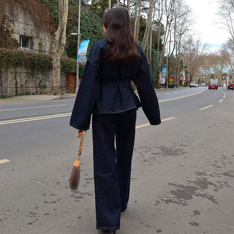 Conjunto de dos piezas de abrigo vaquero informal para mujer, pantalones con cordones y manga larga