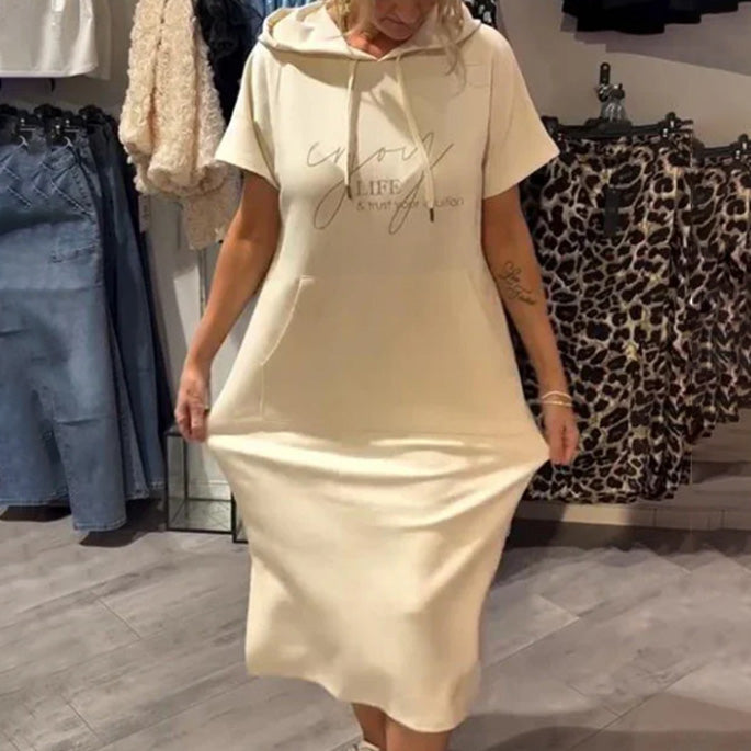 Este versátil vestido con capucha combina comodidad y estilo chic, ofreciendo un corte holgado con bolsillos funcionales y una favorecedora silueta en forma de A. Perfecto para días informales, se adapta fácilmente a diferentes tallas y preferencias de estilo.