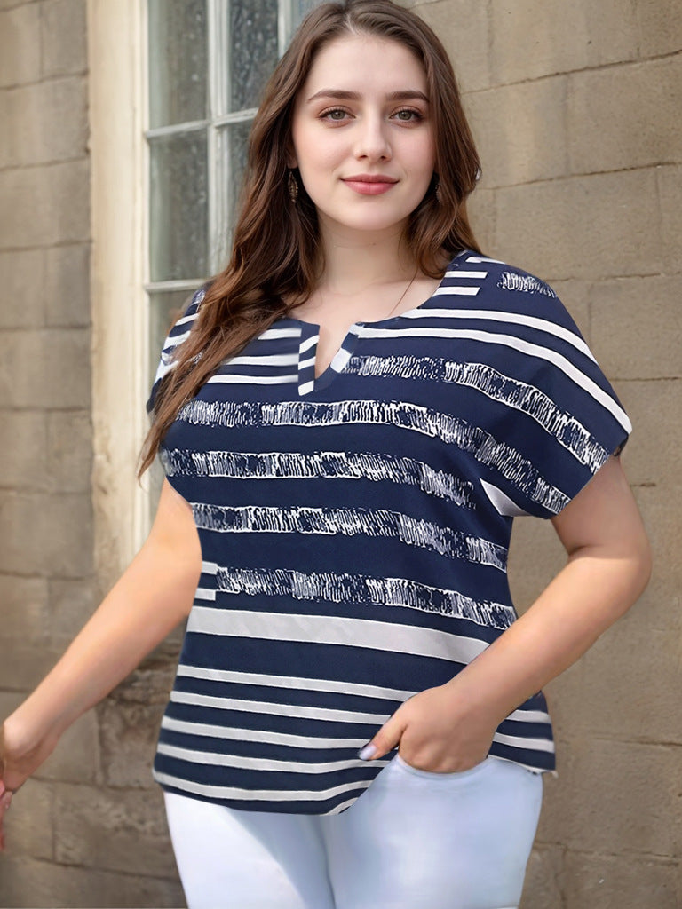 Esta camiseta casual de manga corta con cuello en V y estampado de rayas para mujer, talla grande, es una prenda elegante y cómoda para tu armario. Diseñada para un ajuste favorecedor, esta camiseta informal luce un moderno estampado de rayas y está confeccionada con poliéster de alta calidad para una larga duración.