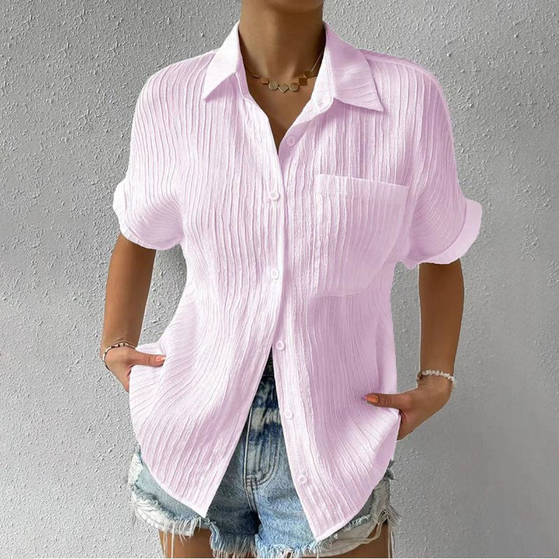 This stylish short-sleeve blouse features a comfortable cotton blend fabric with a classic solid color design. The lapel collar and raglan sleeves provide a fashionable urban look suitable for daily wear. Available in multiple colors and sizes for a versatile wardrobe addition.