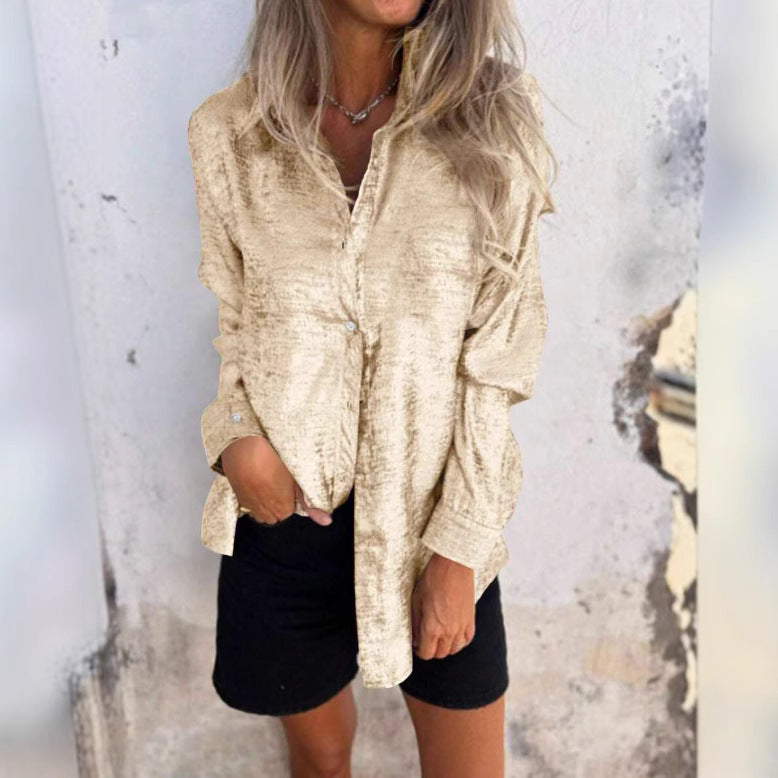 Estilo de diseño: Blusa clásica de manga larga de color sólido con cuello de solapa y manga tipo regular.