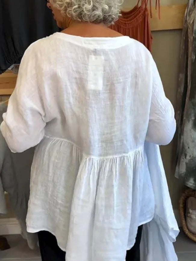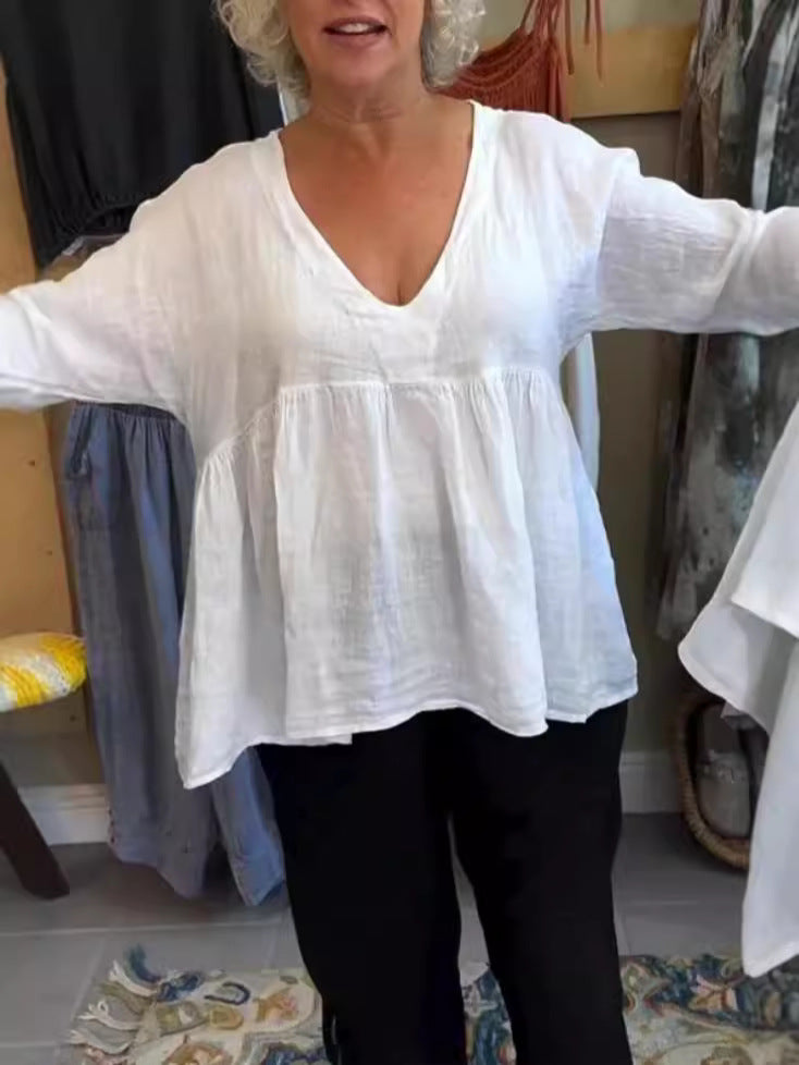 Women Casual Solid Cotton Linen V-Neck Blouse