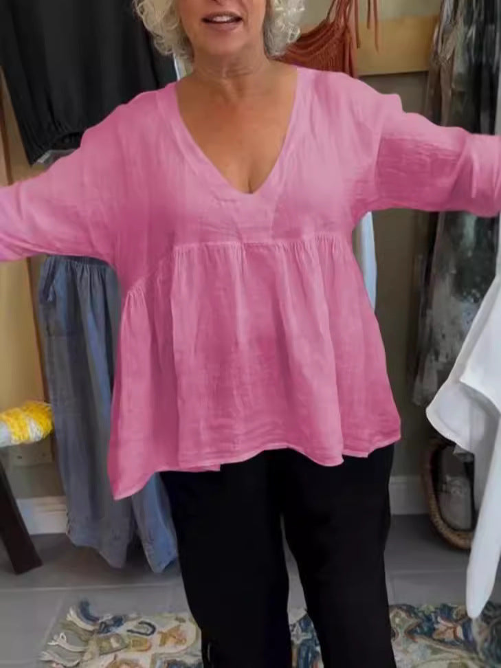 This women's casual blouse combines comfort and style with its solid color design made from a blend of cotton and linen. It features a flattering deep V-neck, long sleeves, and a medium length that makes it suitable for various occasions and easy to pair with different outfits.