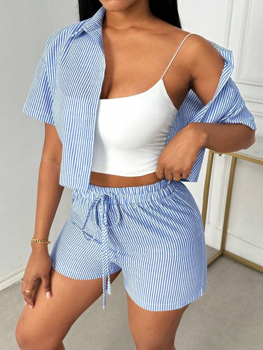 Conjunto informal de blusa a rayas con solapa y pantalones cortos con cordón para mujer