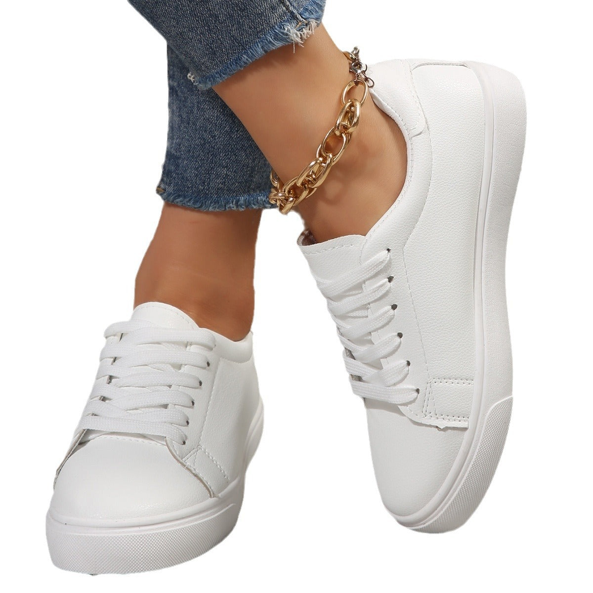 Estas zapatillas casuales para mujer combinan sencillez y comodidad con un color blanco liso y cierre de cordones. Fabricadas en PU artificial con suela de goma, son ideales para el día a día y ofrecen un calzado elegante y práctico.