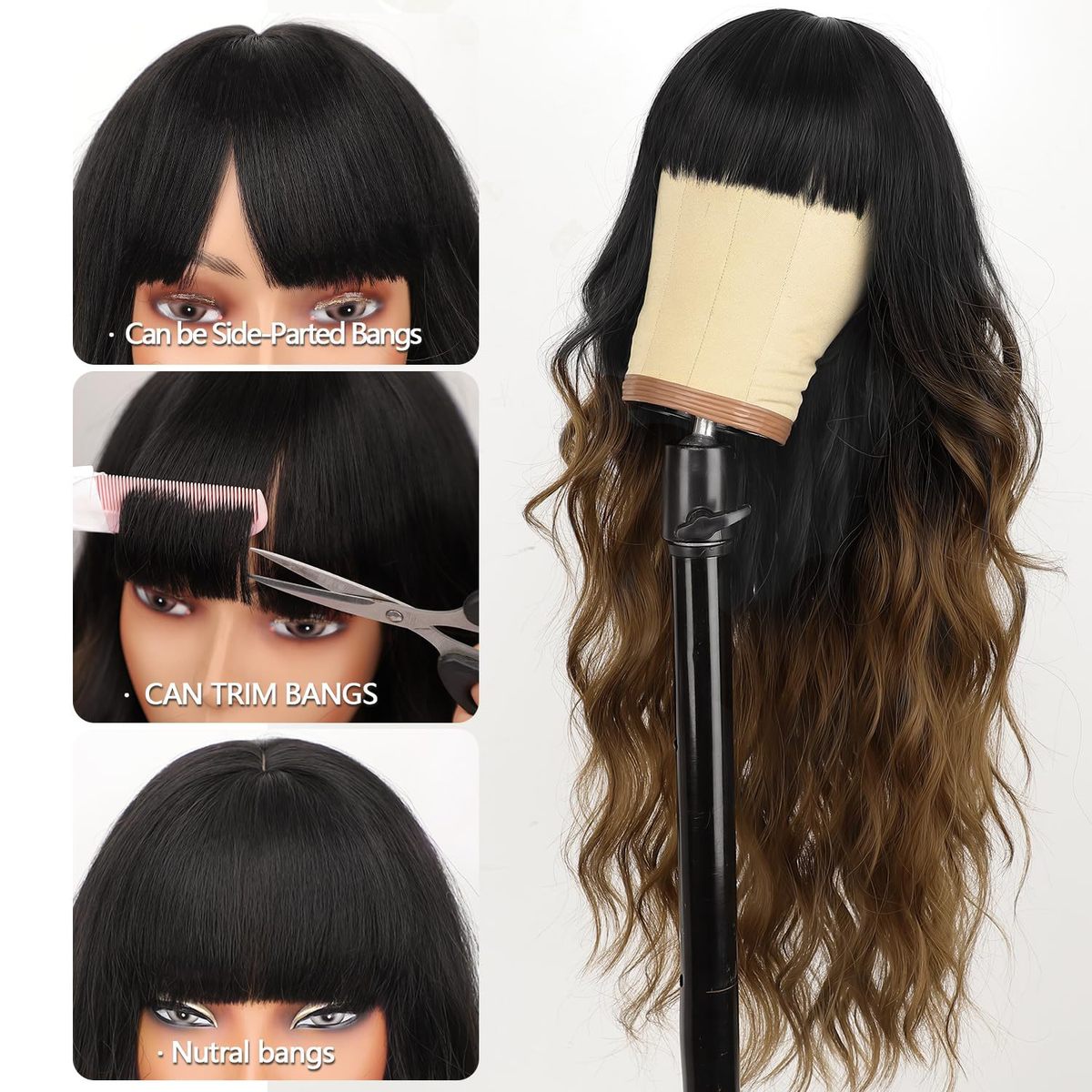 This long curly hair wig features a gradient design with natural bangs, offering a stylish and versatile look. Made from high-temperature wire, it is suitable for various hair colors and styles, enhancing your appearance with volume and elegance. Perfect for dress-up occasions or everyday wear.