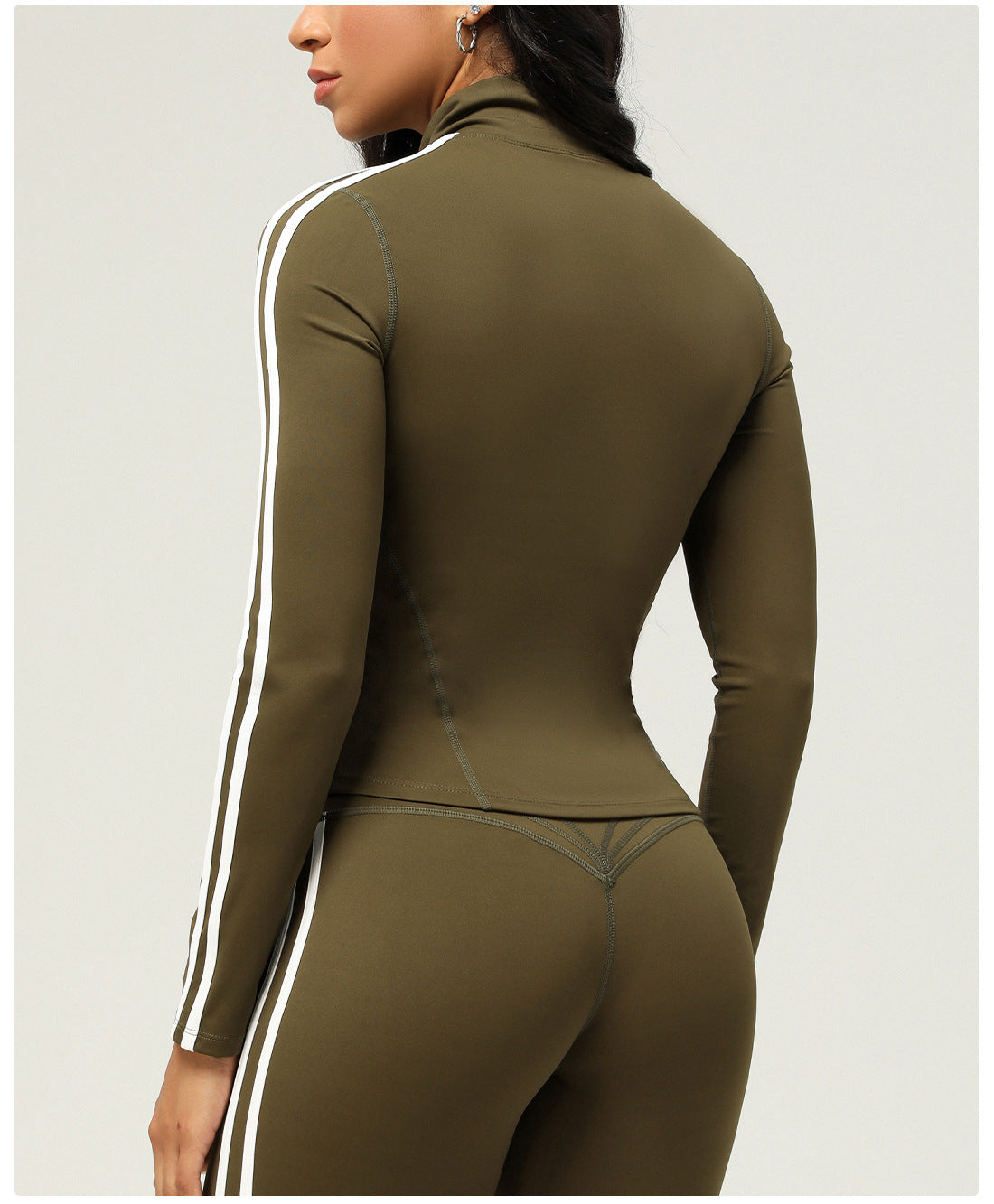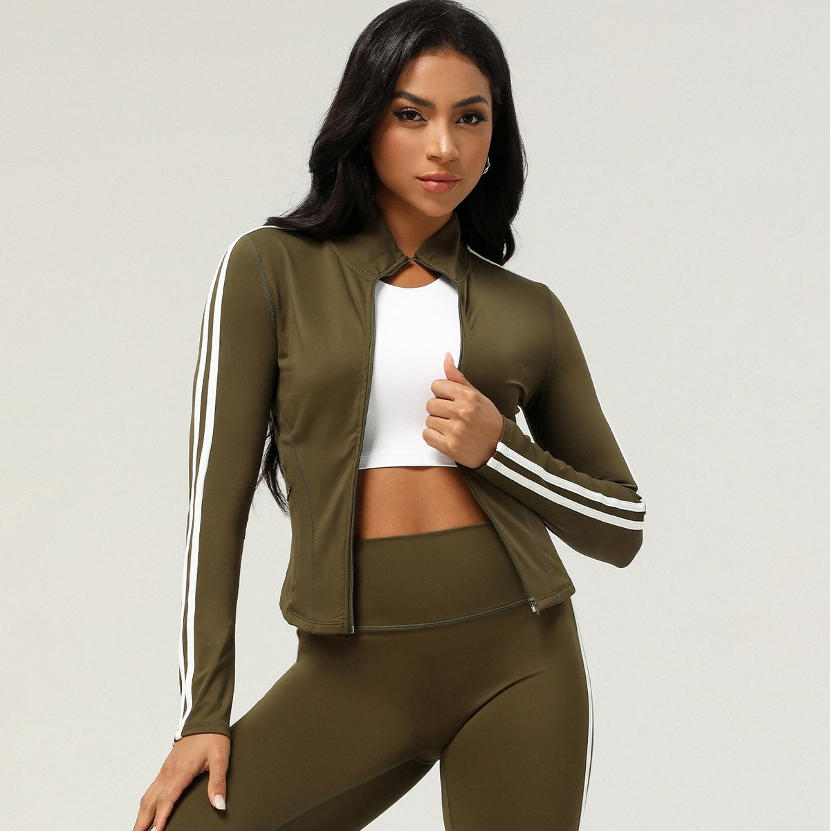 Mejora tu estilo deportivo con nuestra chaqueta deportiva de yoga de manga larga con cremallera y corte ajustado, diseñada para ofrecerte rendimiento y estilo. Esta versátil chaqueta cuenta con cuello alto y un corte elegante que realza tu silueta, además de ofrecer comodidad y funcionalidad durante tus entrenamientos o actividades diarias.