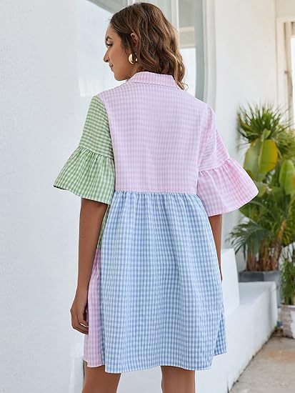 Dale un toque de distinción a tu armario con nuestro vestido holgado informal de manga corta con solapa y costuras a cuadros para mujer. Confeccionado en poliéster de alta calidad, este vestido garantiza comodidad, mientras que sus vibrantes bloques de color y costuras a cuadros lo convierten en una prenda destacada para cualquier ocasión.
