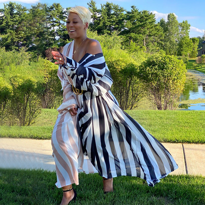 Este vestido casual de talla grande para mujer combina un estilo hipster urbano con una elegante confección. Fabricado en fibra de poliéster de alta calidad, presenta un llamativo estampado de rayas, cuello en V y mangas largas, ofreciendo un ajuste cómodo y moderno para el día a día.