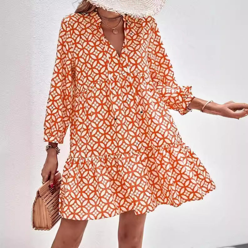 Este vestido casual estampado de manga larga para mujer ofrece un ajuste cómodo y un diseño elegante, perfecto para el día a día. Hecho de poliéster ligero, presenta un versátil cuello en V y una falda evasé que realza cualquier look casual.