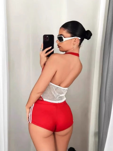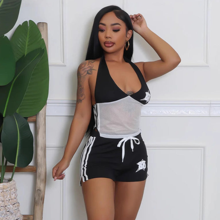 Hecho de material de poliéster de alta calidad, este elegante conjunto de dos piezas incluye un top corto con cuello halter de color en contraste sin mangas y pantalones cortos de cintura baja, ideal para uso casual y de moda.