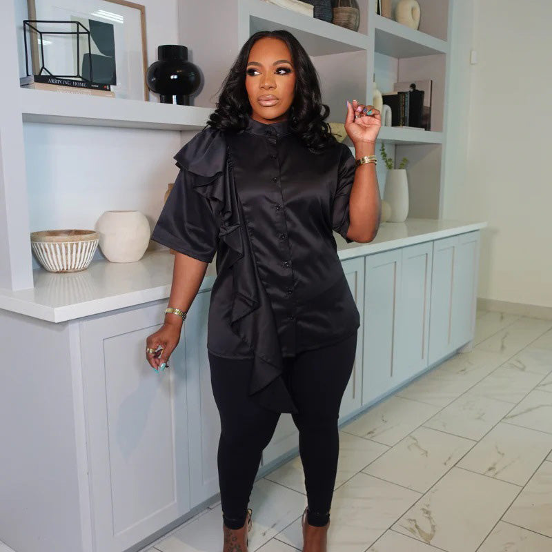 Esta blusa combina elegancia y comodidad para el día a día, con un tejido ligero y transpirable que garantiza comodidad durante todo el día. Su sofisticado diseño con volantes y sus colores lisos la convierten en una prenda versátil para usar en capas o sola, perfecta para el trabajo o para salidas informales.