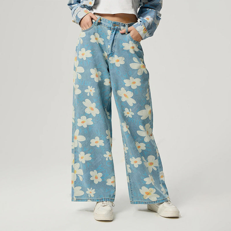 Estos elegantes jeans rectos con estampado floral retro están confeccionados en resistente denim de algodón y poliéster. Diseñados para ofrecer comodidad y versatilidad urbana, presentan un corte a media cintura y un largo clásico.