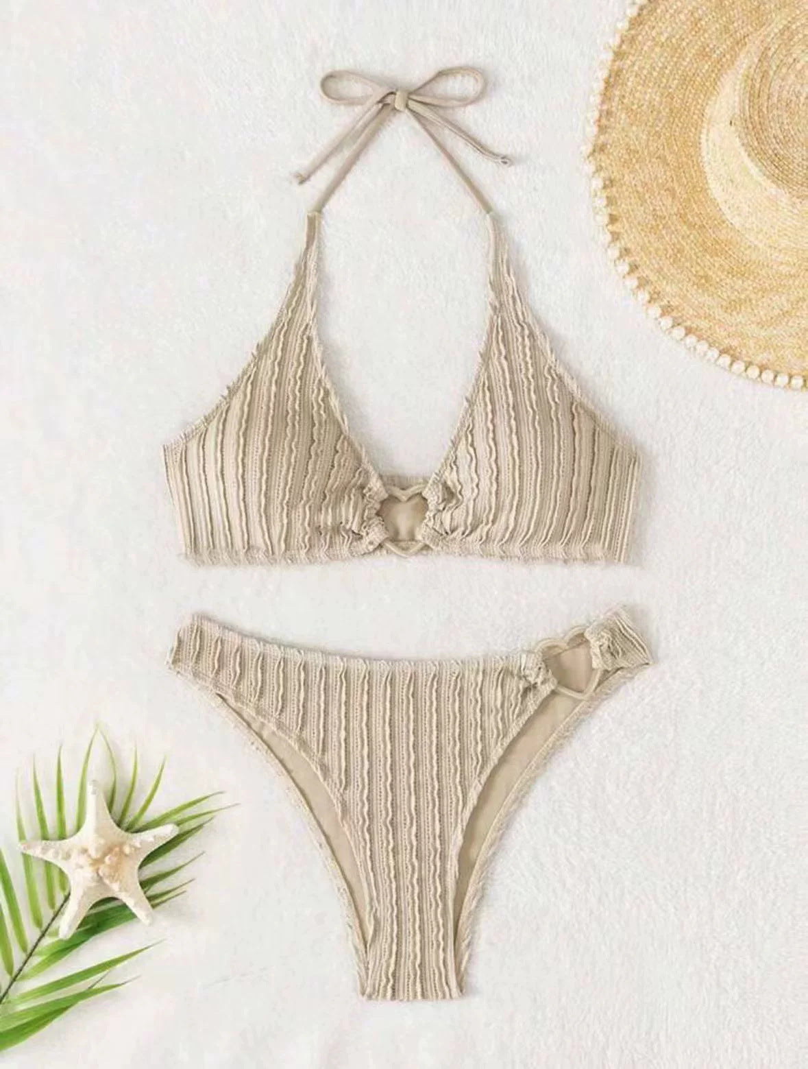 Traje de baño bikini sexy de rayas de color liso con cuello halter para mujer