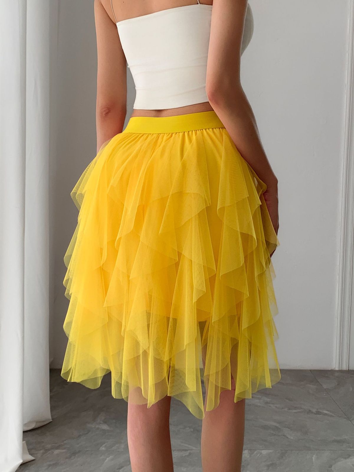 Women Fashion Solid Color Mesh Irregular Hem Skirt