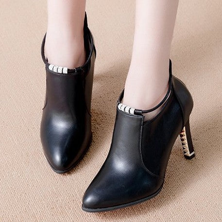 Disfruta de la comodidad y el estilo de estos tacones altos de moda para mujer, confeccionados en resistente cuero artificial y suela de goma. Con un elegante diseño de punta, botas hasta el tobillo y un práctico cierre de cremallera lateral, estos zapatos son perfectos para realzar tu look casual o semiformal.