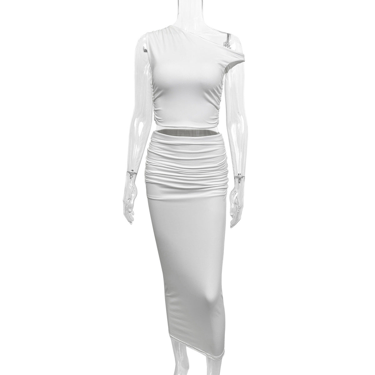 Women Fashion Solid Color Shoulder Top And Skirt Two-Piece Set
