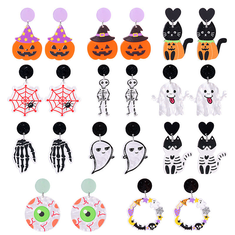 Estos aretes colgantes con temática de Halloween presentan encantadores diseños de calabazas, gatos, fantasmas, arañas y esqueletos, elaborados en acrílico resistente. Su divertido estilo geométrico los hace perfectos para usar con accesorios festivos y ropa informal.