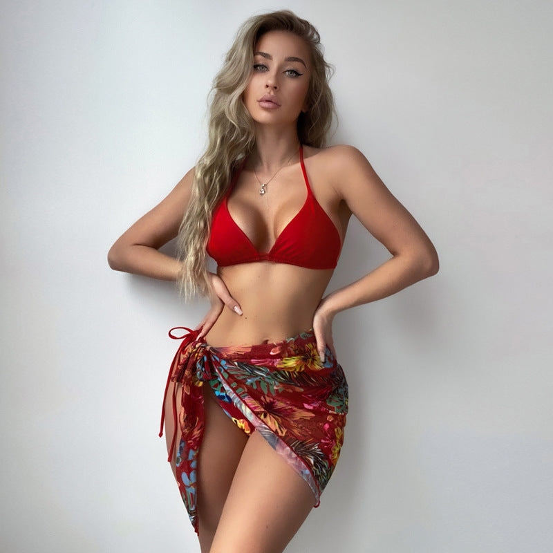 The set includes a printed bikini top, matching bottom, and an additional piece, available in black, orange, red, and rose colors. The eye-catching prints make it suitable for casual swimming, sunbathing, or beach parties.