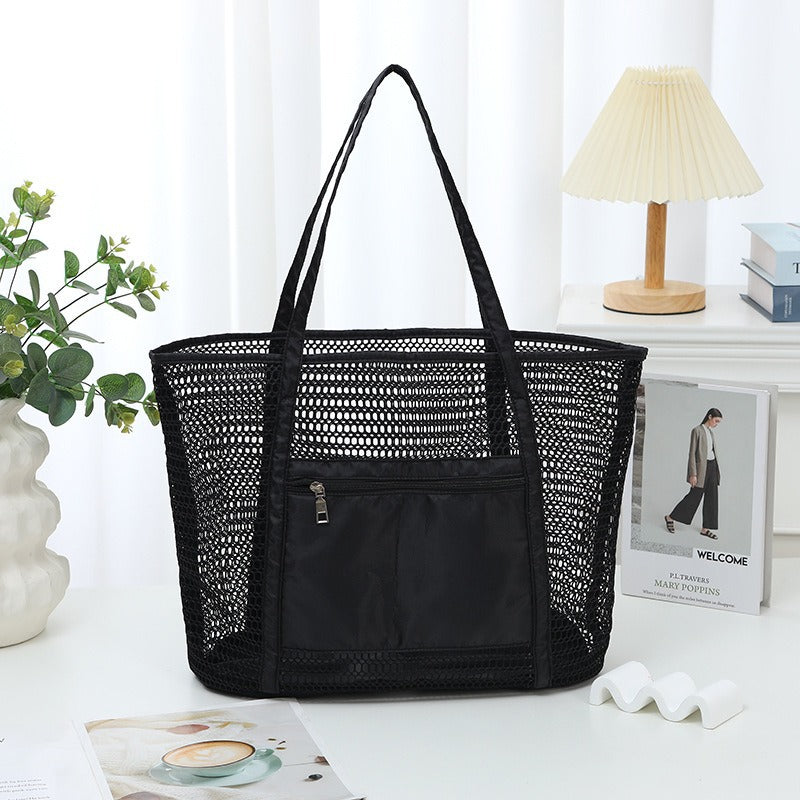 Este elegante bolso de malla combina practicidad y simplicidad, perfecto para llevar todos tus elementos esenciales cómodamente y mantener un aspecto moderno durante tus viajes o actividades de ocio.