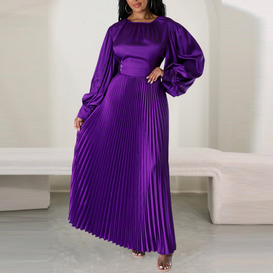 El vestido presenta un clásico cuello redondo y mangas de nueve puntos, combinando estilo y comodidad. Su diseño plisado de cintura alta aporta volumen y elegancia, ideal para eventos formales o salidas informales. Disponible en tallas de la S a la 3XL para adaptarse a diferentes tipos de cuerpo.