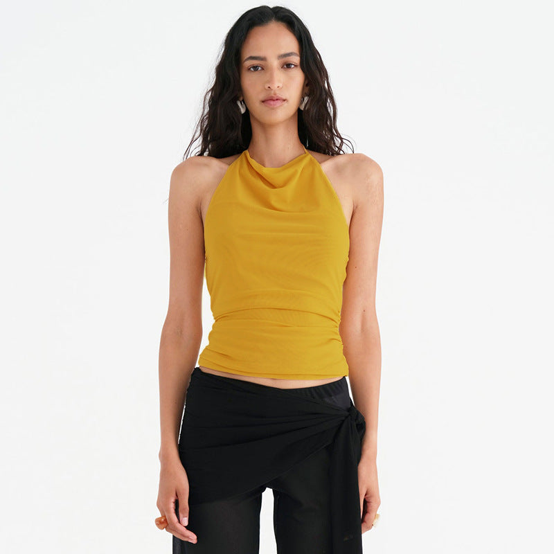 The halter-neck style enhances shoulder and neckline highlighting, while the sleeveless design allows for free arm movement. The garment length ranges from 40cm to 50cm, making it a perfect short top for warm weather or layering. The slim version ensures a close fit for a modern silhouette.