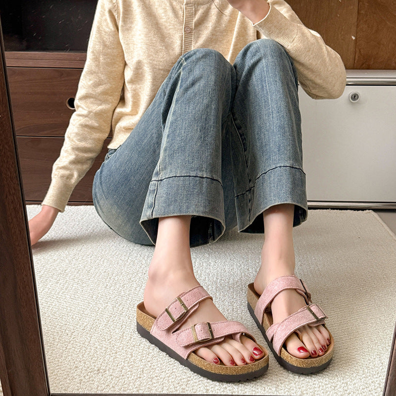 These women’s summer slippers feature a stylish retro design with a comfortable cork insole, suede upper, and durable rubber sole. Available in multiple colors, they provide both fashion and comfort for warm-weather wear.