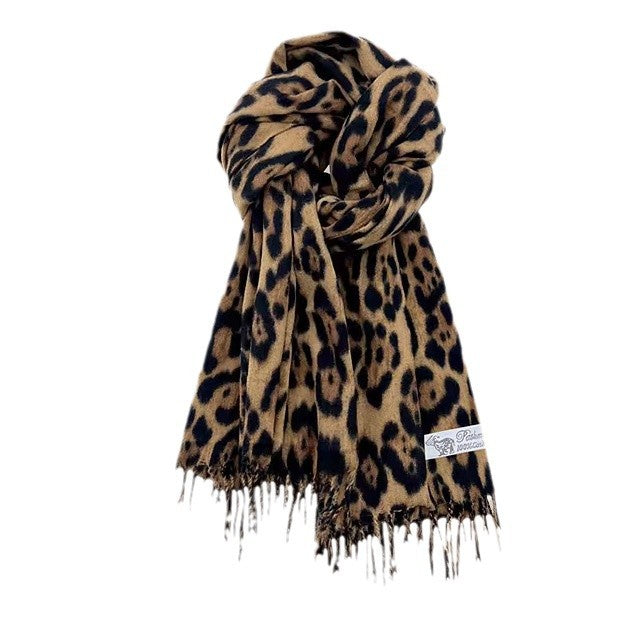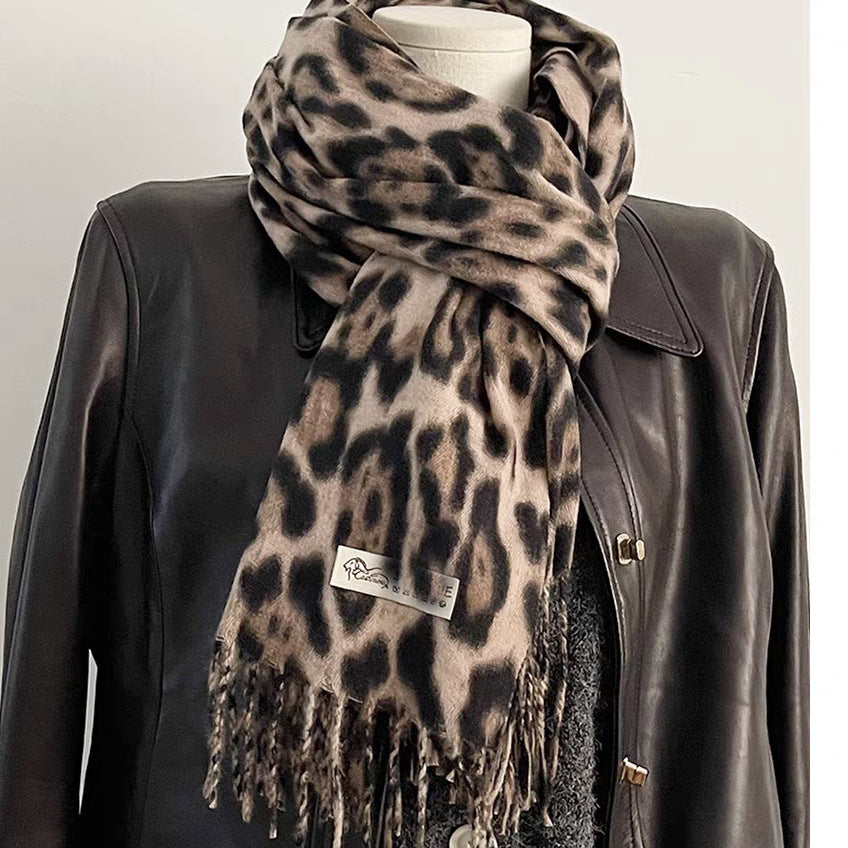 Bufanda con borlas de leopardo vintage, elegante y fresca, para mujer
