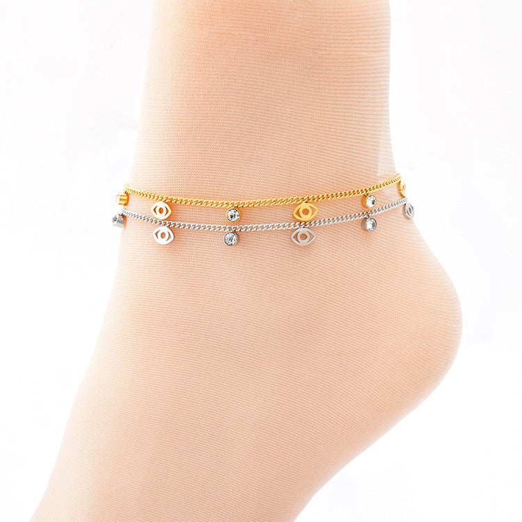 Presentamos la tobillera de circonitas con ojo de diablo para mujer, un accesorio deslumbrante que combina estilo y sofisticación. Fabricada en acero de titanio de alta calidad, esta tobillera presenta un diseño geométrico único adornado con circonitas que le dan un toque de elegancia. Disponible en oro y acero, es el complemento perfecto para cualquier look.
