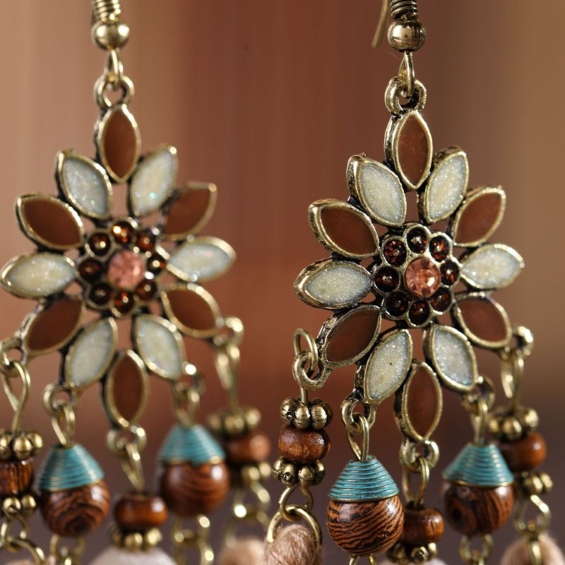 Boucles d'oreilles à pompons en perles de bois et fleurs de Bohème
