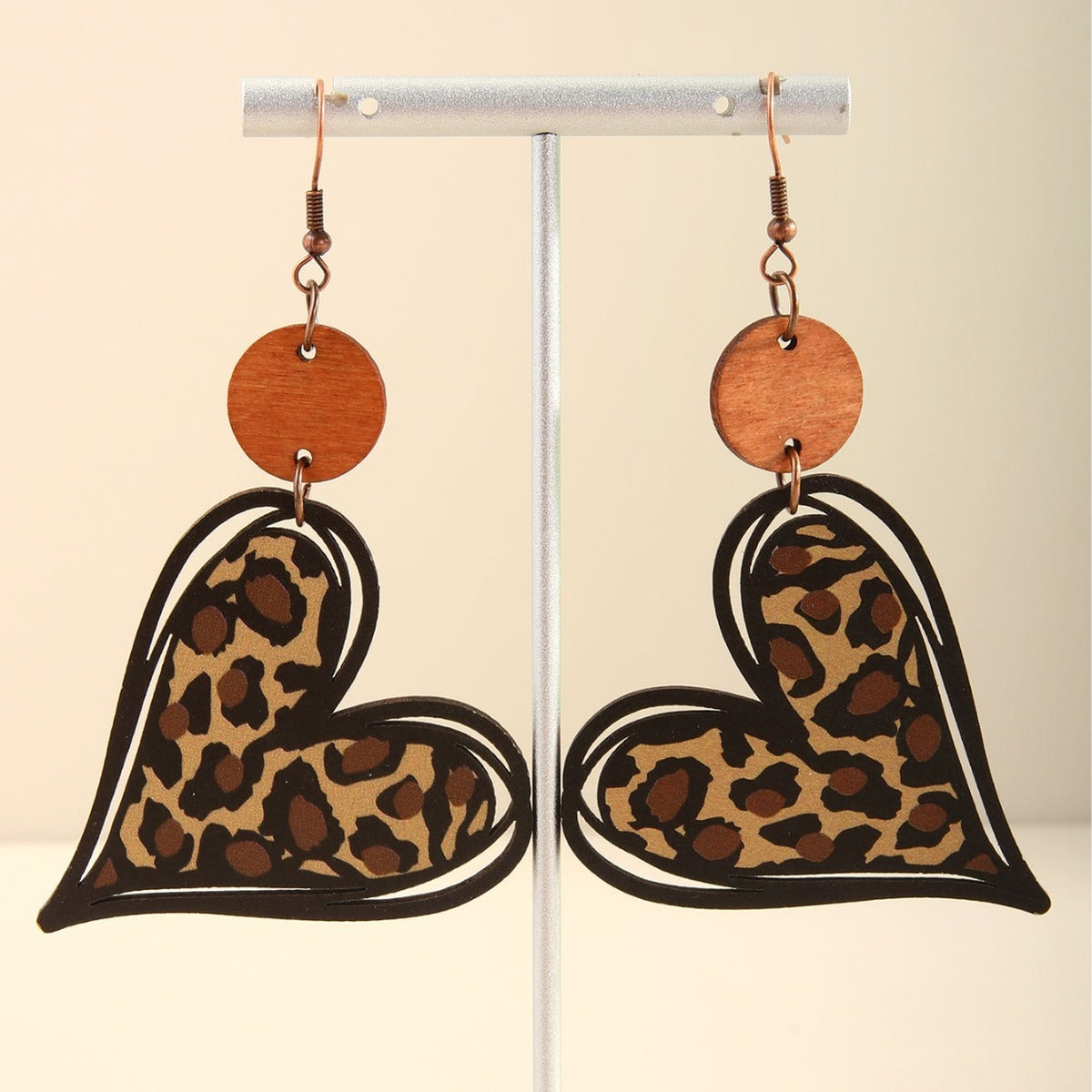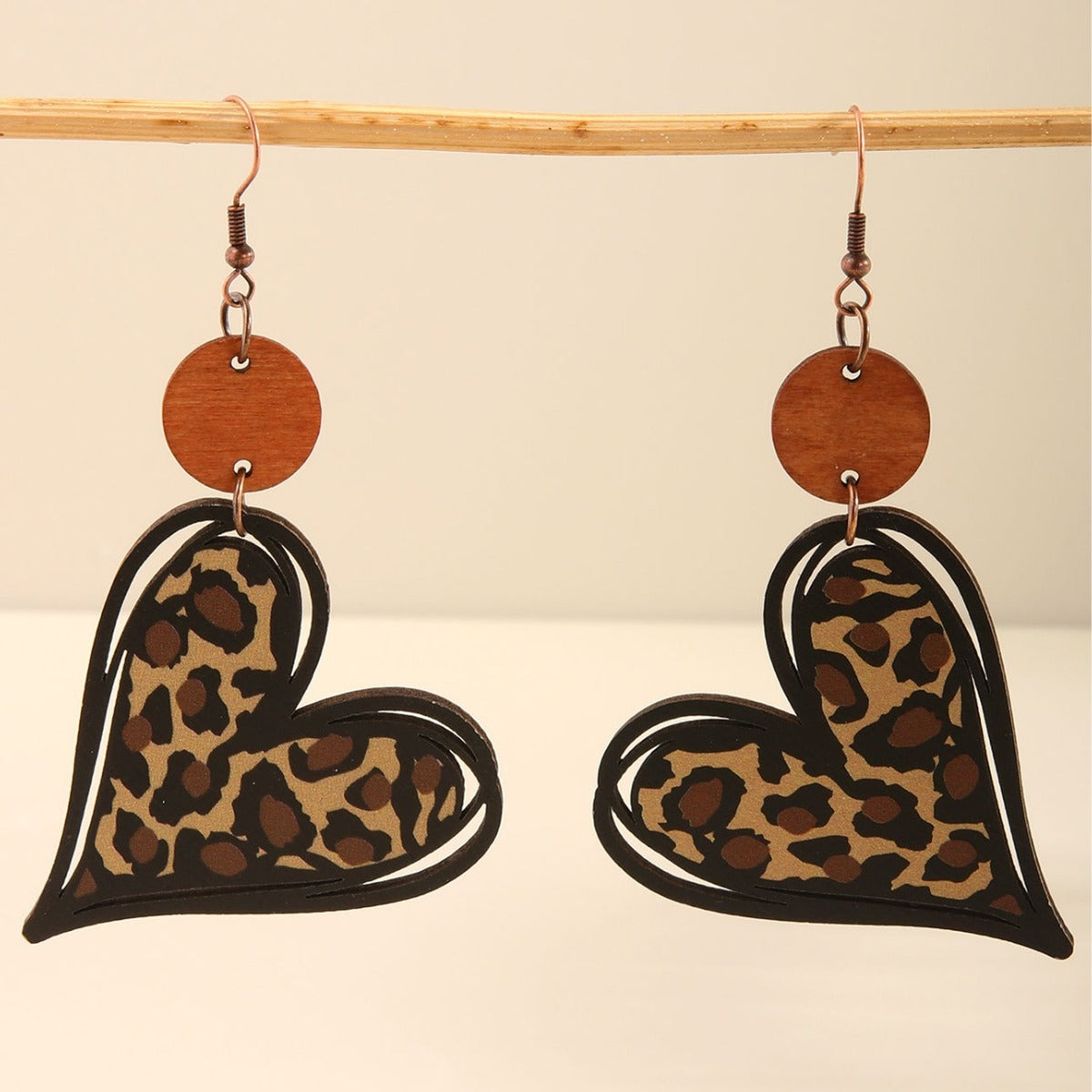 Boucles d'oreilles bohèmes en copeaux de bois en forme de cœur motif léopard