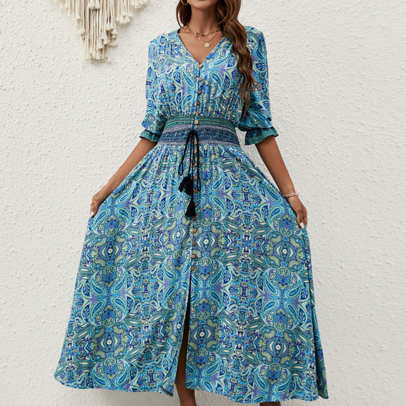 Robe longue décontractée à col en V pour femme, style bohème, idéale pour les vacances