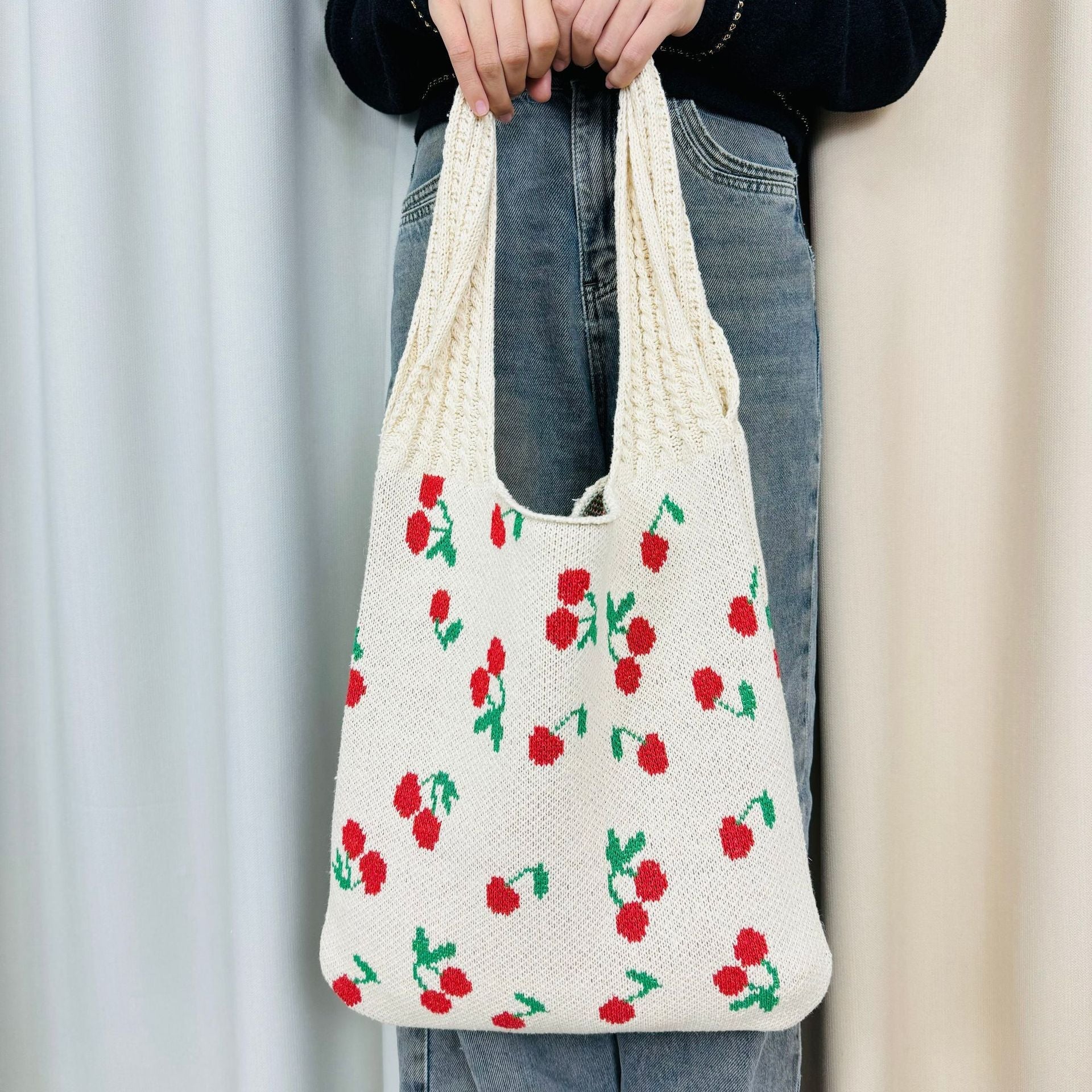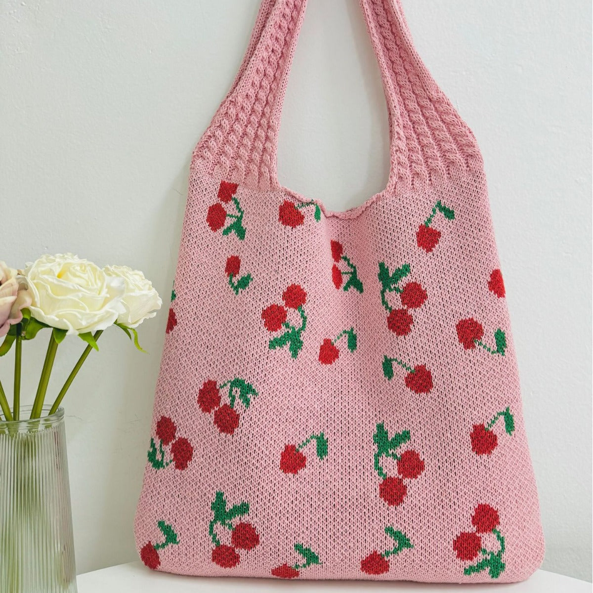 Cherry Print Cute Shoulder Bag Knit Tote Bag