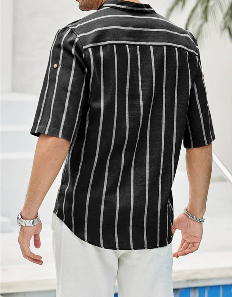 Men's Casual Linen Stripe Lapel Short Sleeve Shirt