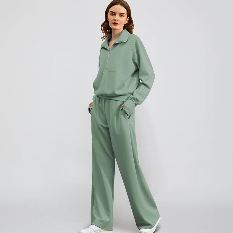 Design: Solid color design with a long length sweatshirt featuring a half-zip collar and wide-leg pants, making it versatile for casual streetwear styles.