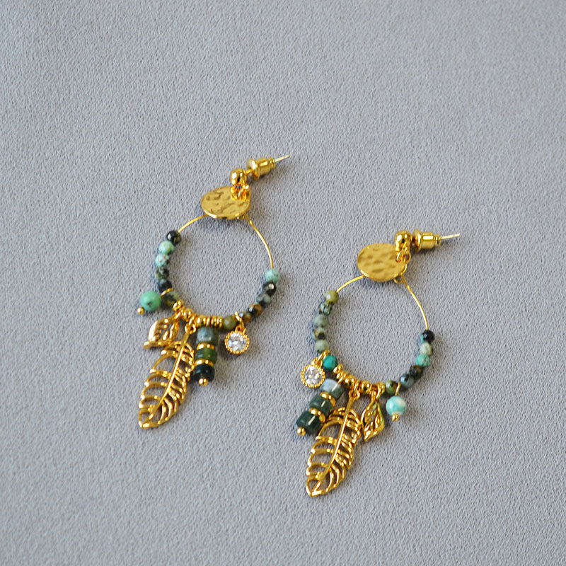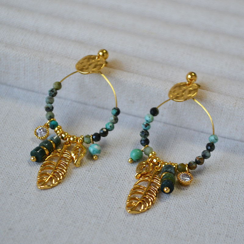 Turquoise Hoop Tassel Leaf Drop Stud Earrings